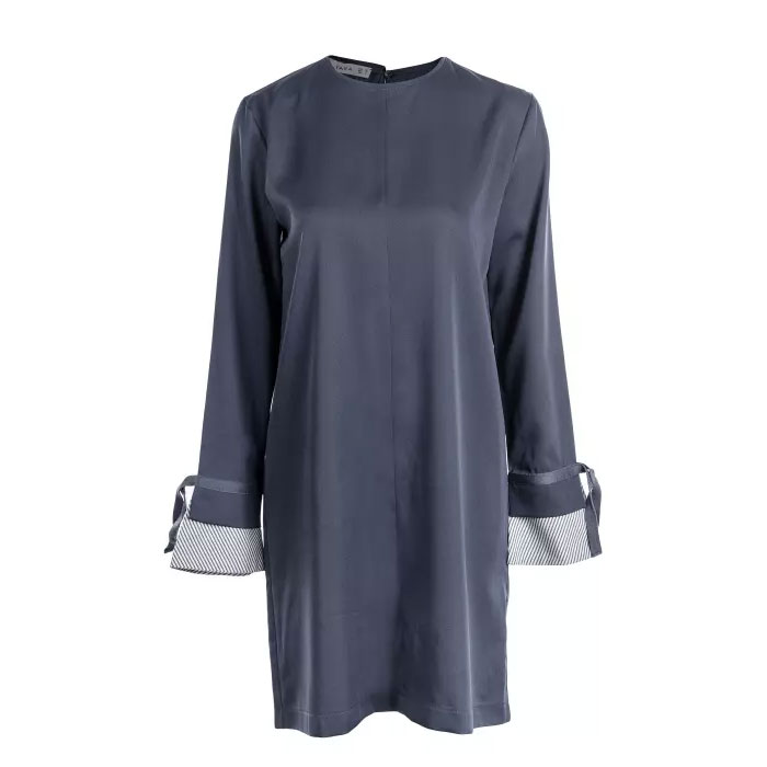 جزئیات مدل | تکه دوزی و بند تزئینی در سرآستین، چاک به همراه دکمه در یقه |